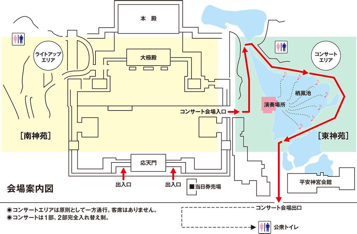 コンサートエリアの「東神苑」、桜のライトアップエリアの「南神苑」両方をご鑑賞いただけます。